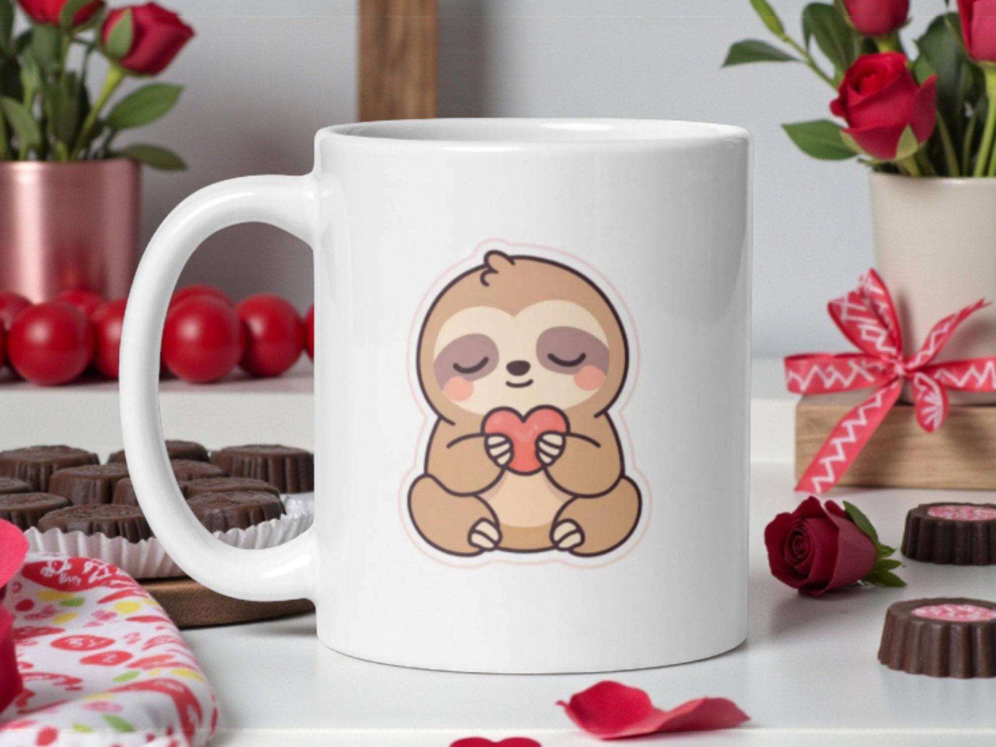 This shy kawaii sloth holding a heart creates a gentle, sweet Valentine mug perfect for subtle romance or friendship gifting.