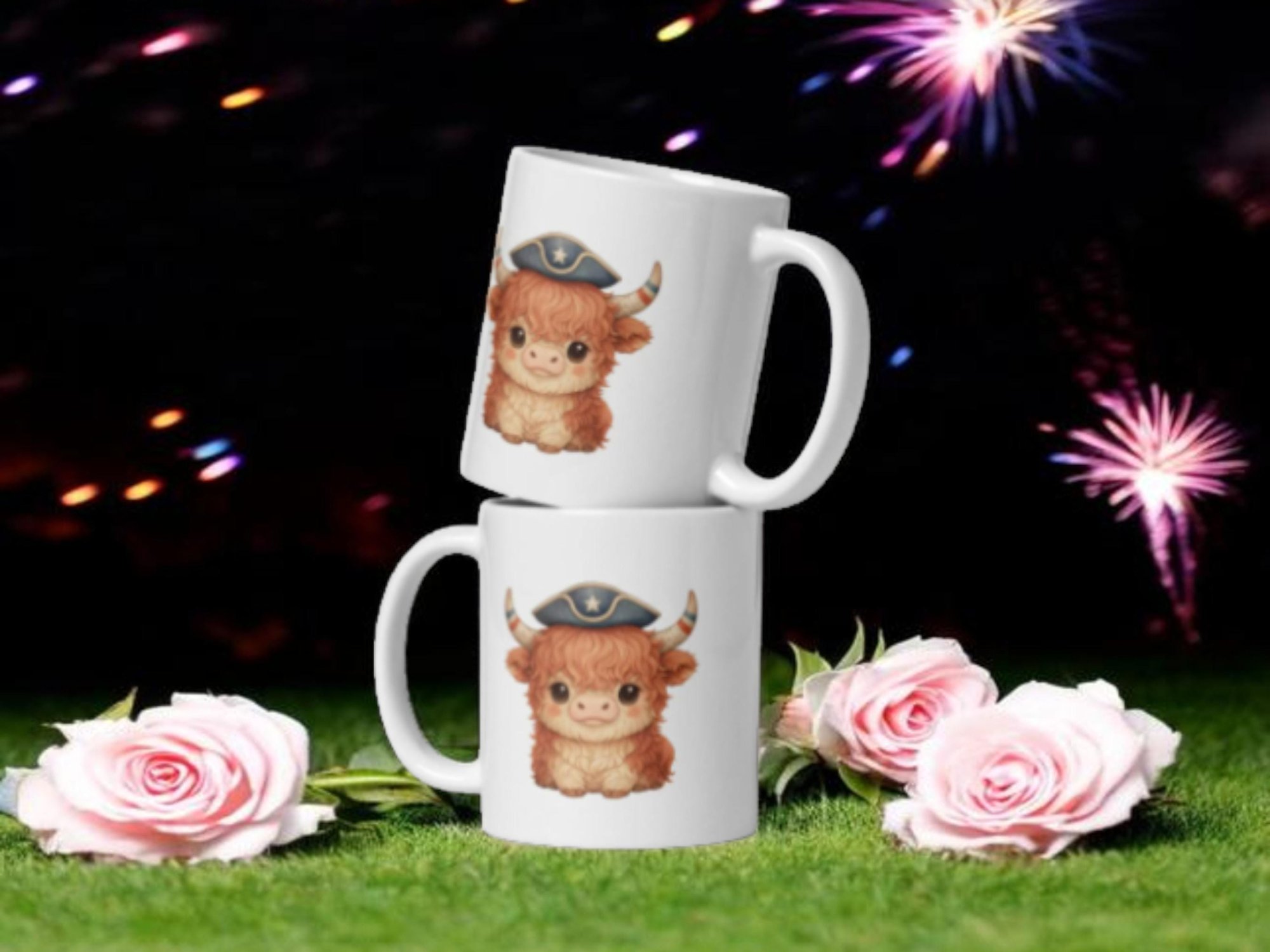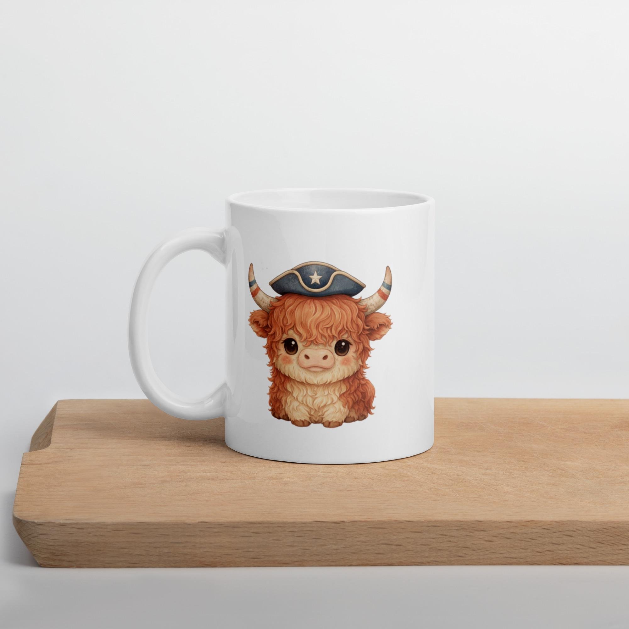 Vintage Americana meets kawaii charm in this cozy colonial highland cow mug. Soft rustic tones and subtle 1776 vibes make it perfect for farmhouse decor lovers and patriotic coffee drinkers.