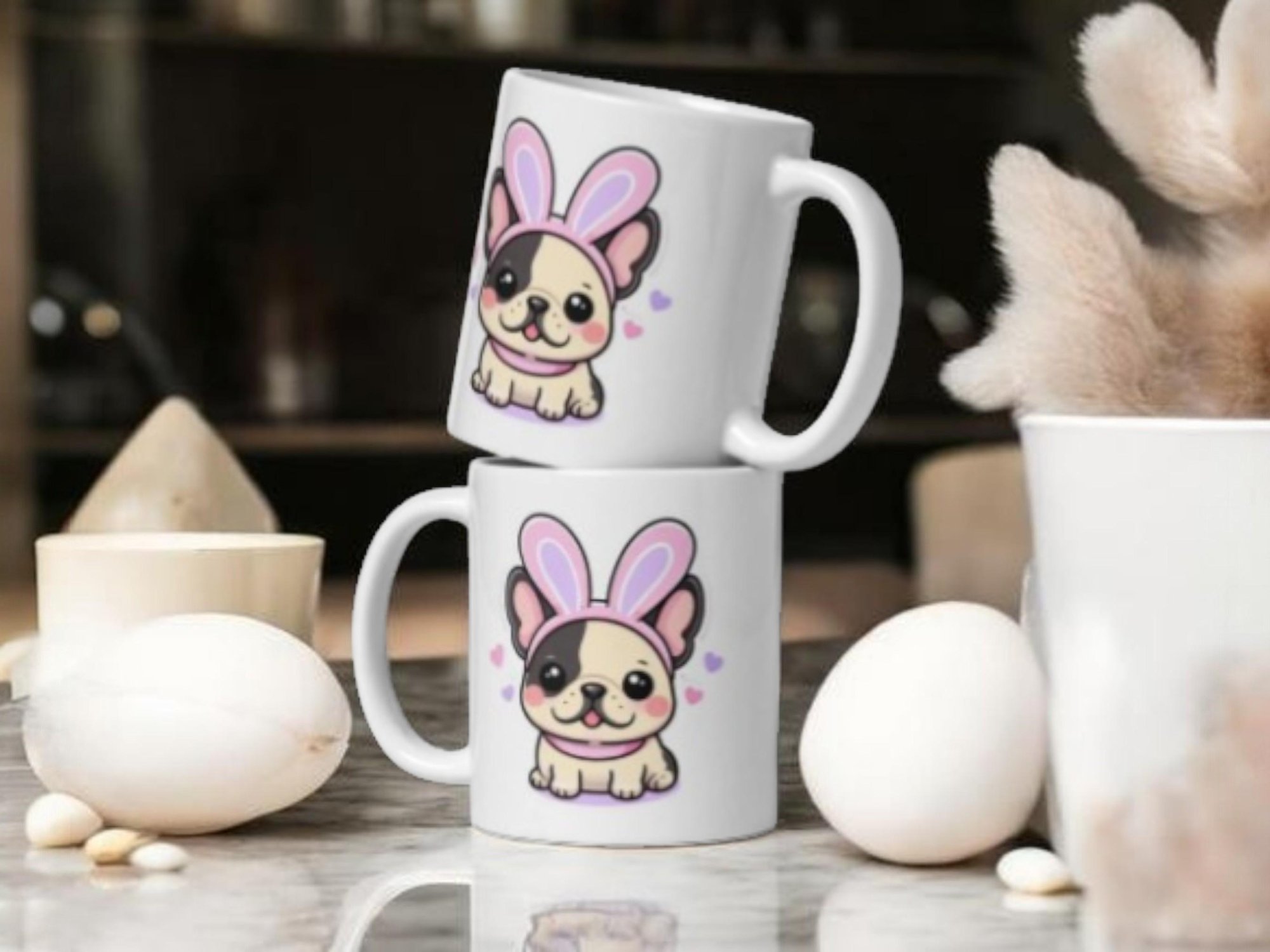 This sweet French bulldog wearing soft bunny ears adds a playful Easter vibe to your coffee routine. The cute expression and pastel accents make this mug feel festive while still keeping the adorable Frenchie personality front and center.