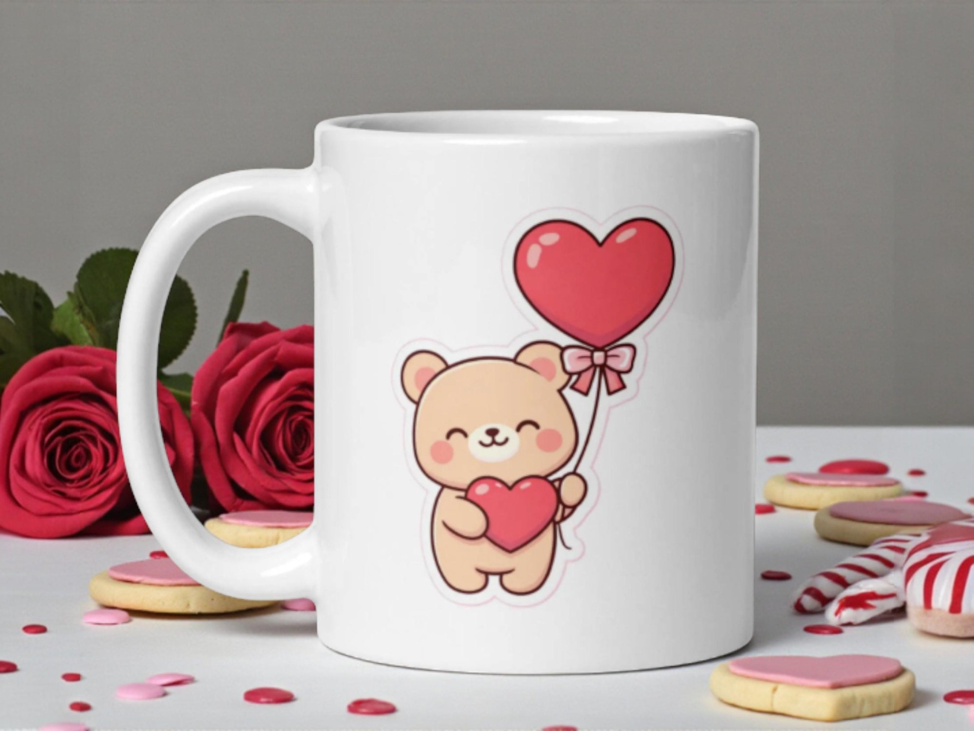 A cheerful kawaii bear holding a heart balloon makes this Valentine mug playful, bright, and perfect for spreading love in a fun way.