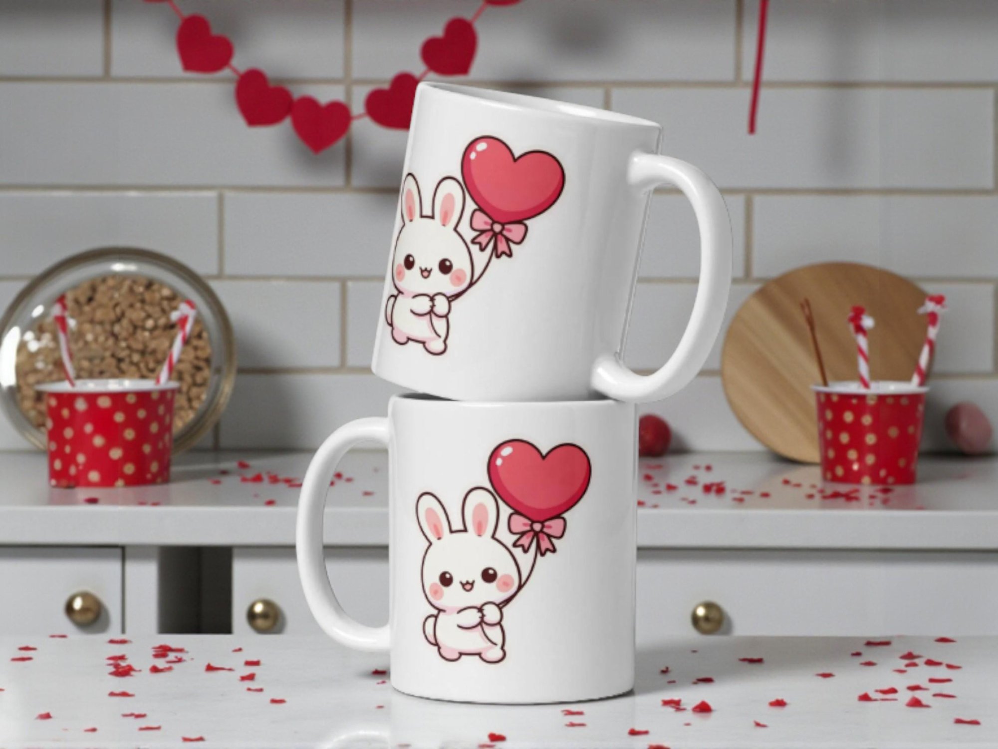 A cheerful kawaii bunny holding a heart balloon makes this Valentine mug playful, bright, and perfect for spreading love.