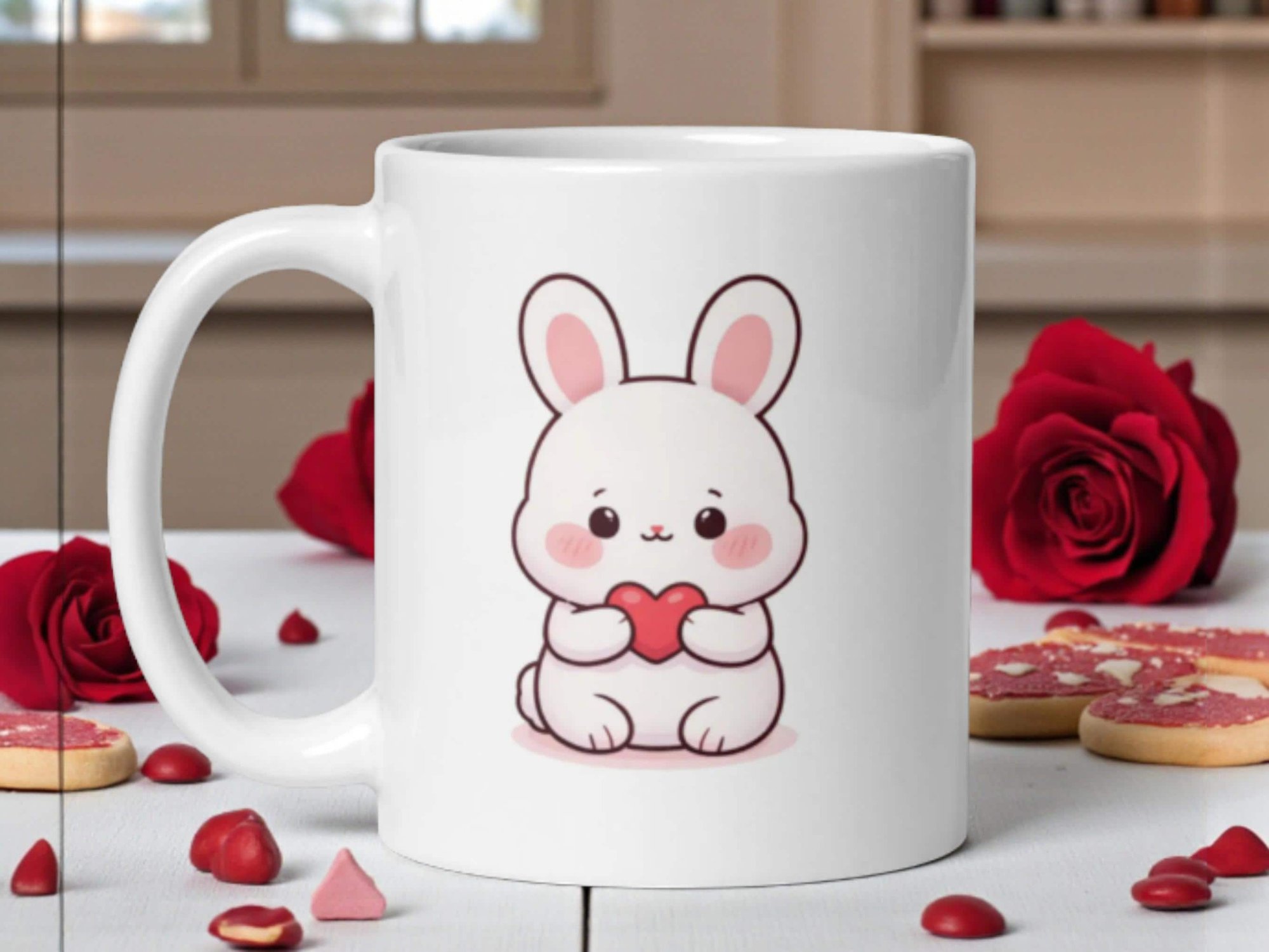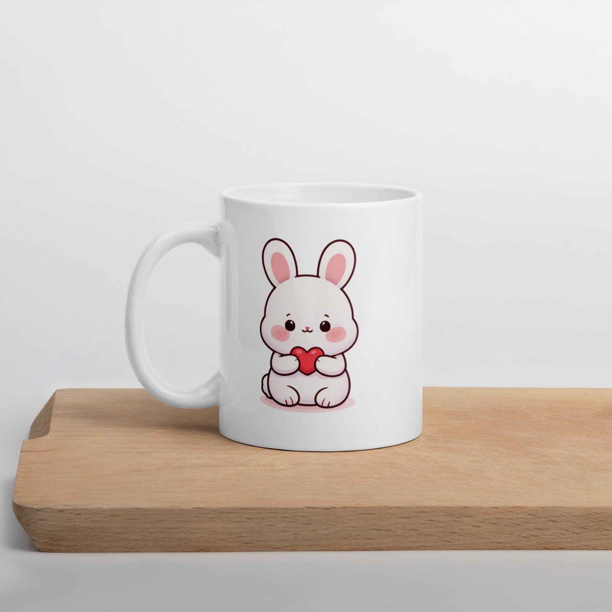 This shy kawaii bunny holding a heart creates a gentle, sweet Valentine mug perfect for subtle romance or friendship gifting.