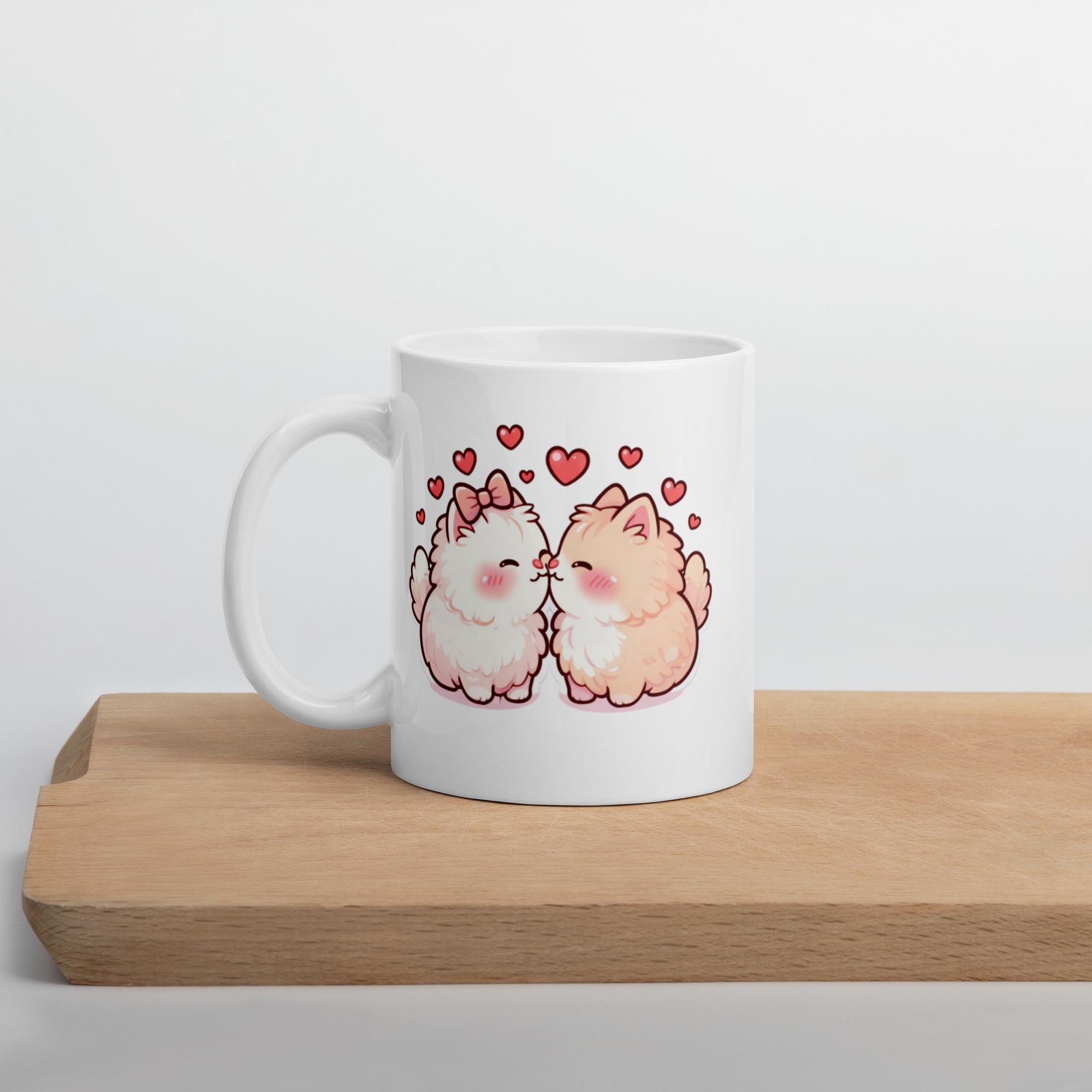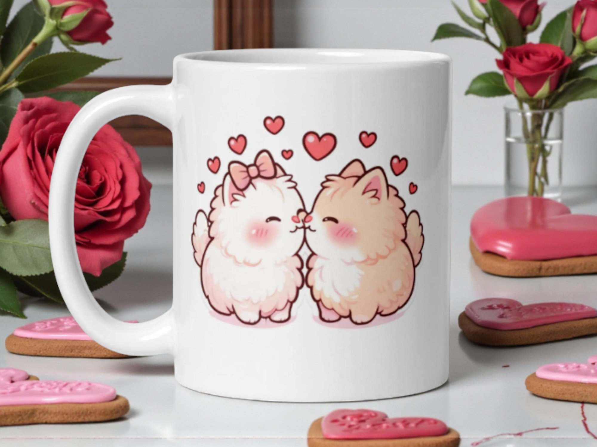 This adorable kawaii cat Valentine mug features a sweet cat couple touching noses. Soft, romantic, and irresistibly cute, it’s perfect for couples who love cozy animal designs and heartfelt gifts.