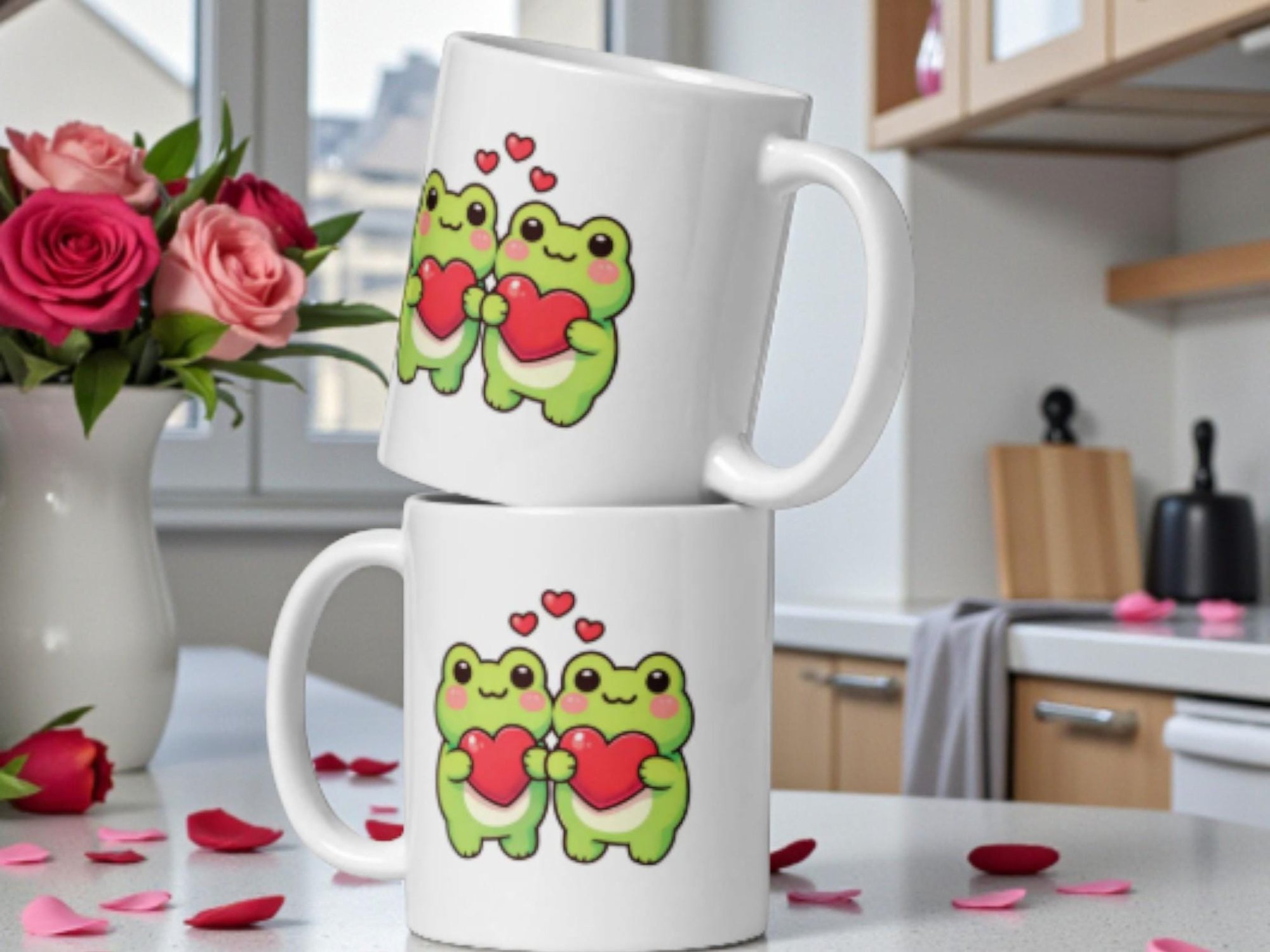 This adorable kawaii frog Valentine mug features a sweet frog couple holding hearts. Soft, cheerful, and wholesome, it’s perfect for couples who love cute animal art and cozy coffee moments.