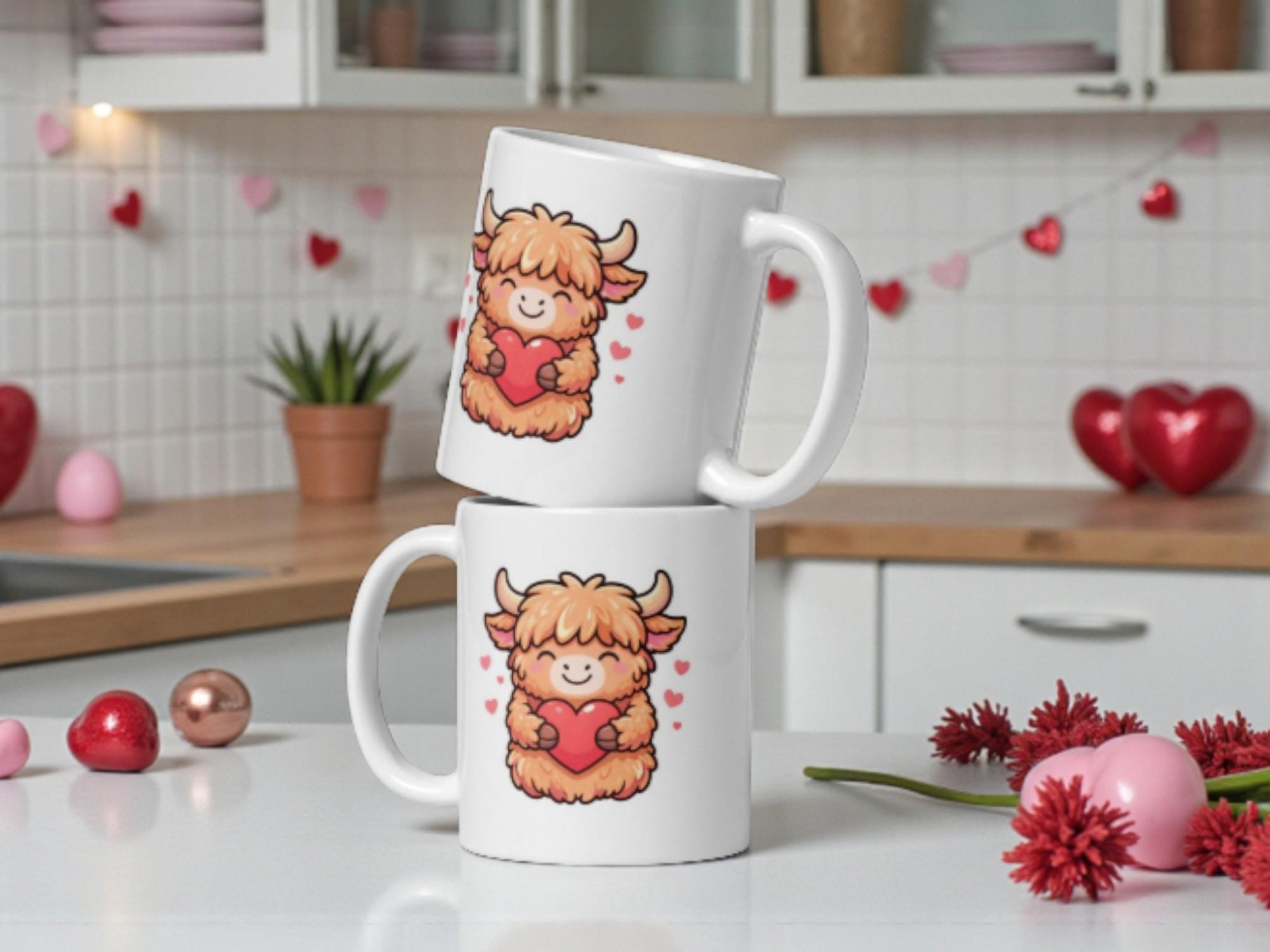 A cheerful kawaii Highland cow holding a heart makes this Valentine mug sweet, giftable, and perfect for cozy mornings.