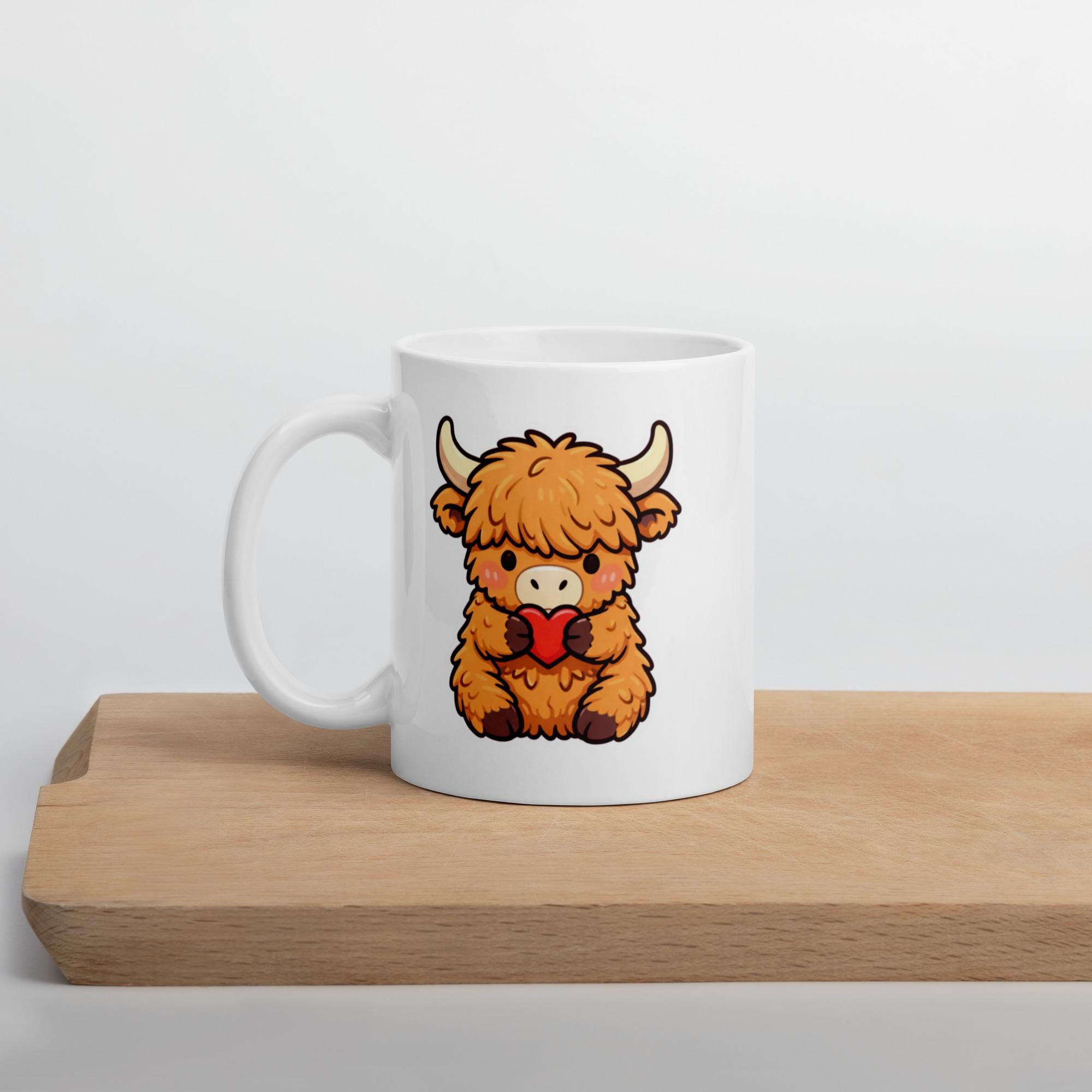 This shy kawaii Highland cow holding a heart creates a gentle, sweet Valentine mug perfect for subtle romance or friendship gifting.