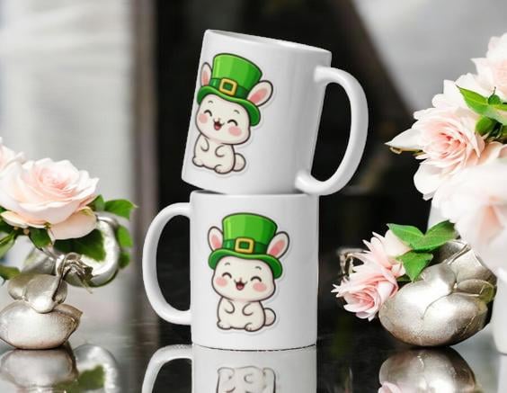 This kawaii bunny wearing a leprechaun hat is ready to bring the luck. A cheerful and festive mug perfect for St. Paddy’s Day gifting.