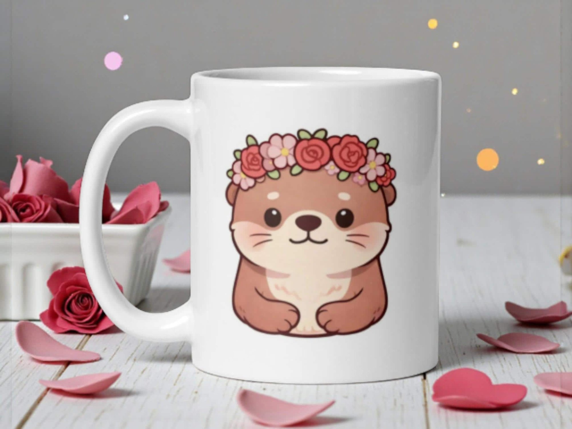 A calm and charming kawaii otter wearing a Valentine flower crown makes this mug perfect for cozy mornings and sweet gifting.