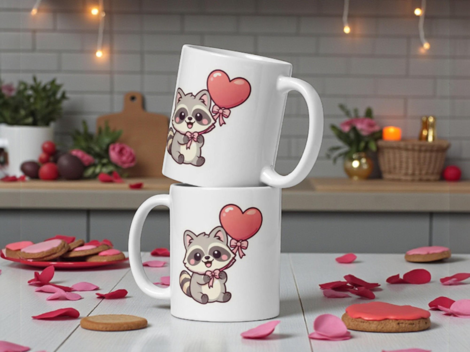 A cheerful kawaii raccoon holding a heart balloon makes this Valentine mug playful, bright, and perfect for spreading love in a fun way.