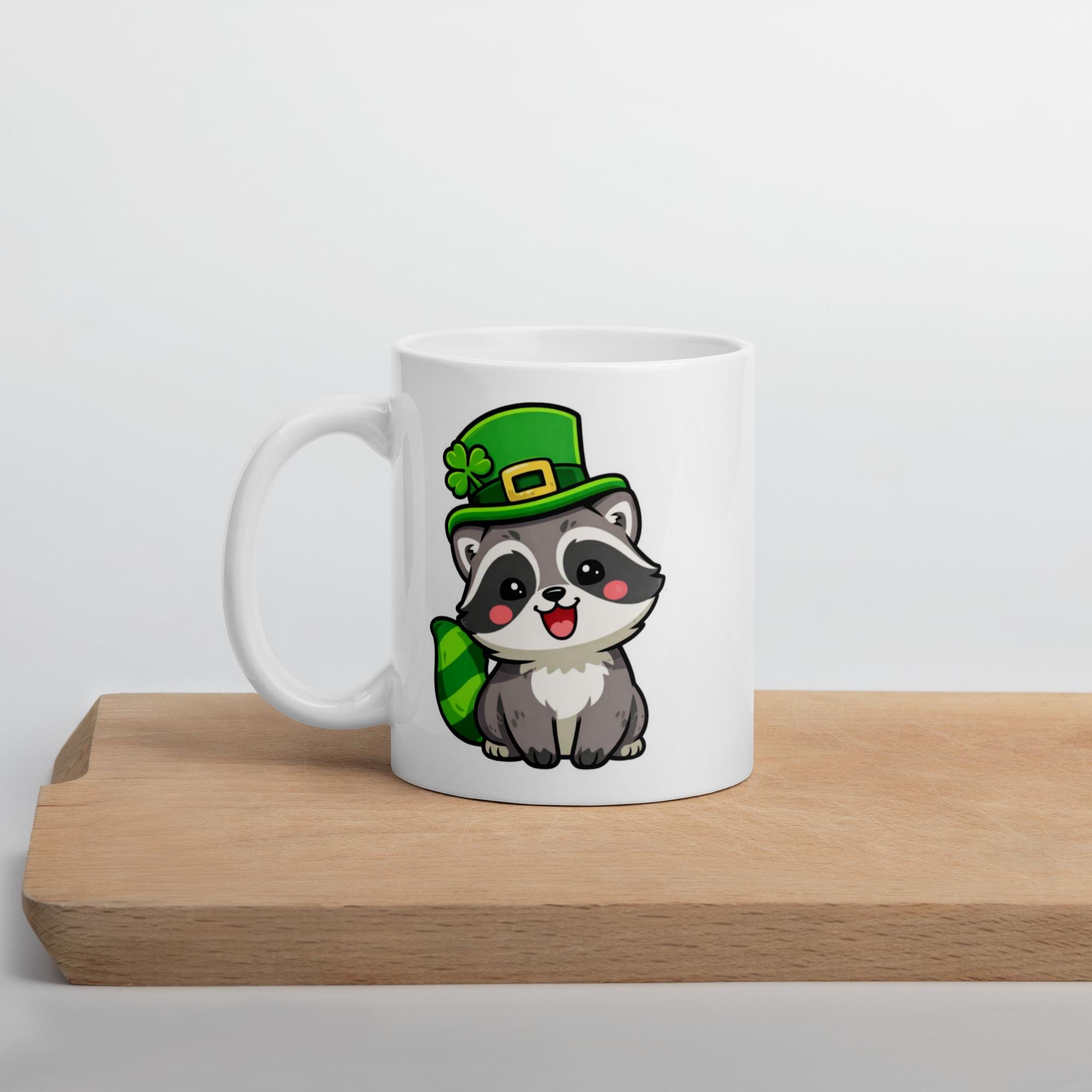 This kawaii raccoon rocking a leprechaun hat is ready to bring the luck. A cheerful St. Paddy’s Day mug for animal lovers.