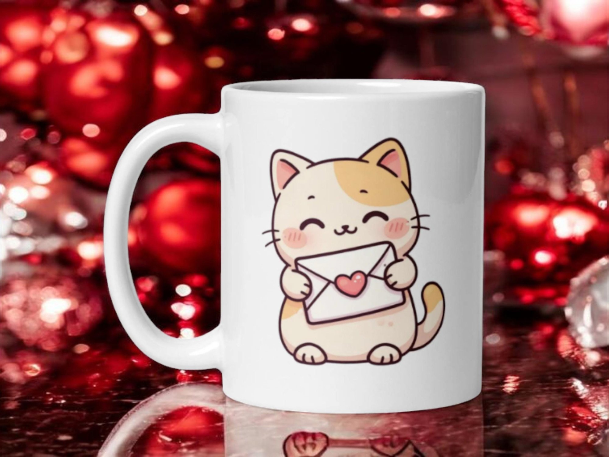 This sweet kawaii cat holding a love letter creates a charming Valentine mug perfect for romantic gifting, Galentine’s, or friendship gifts.