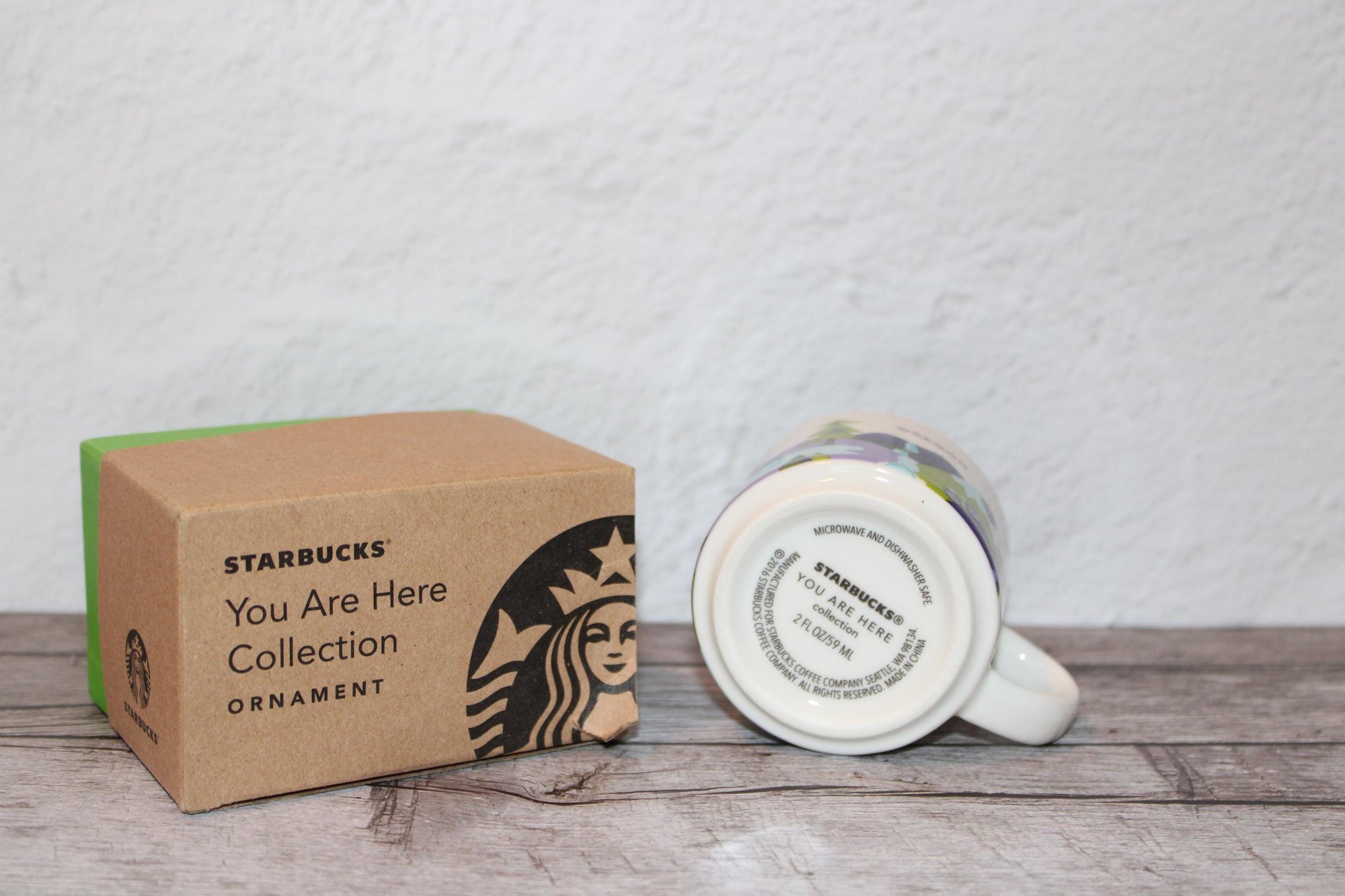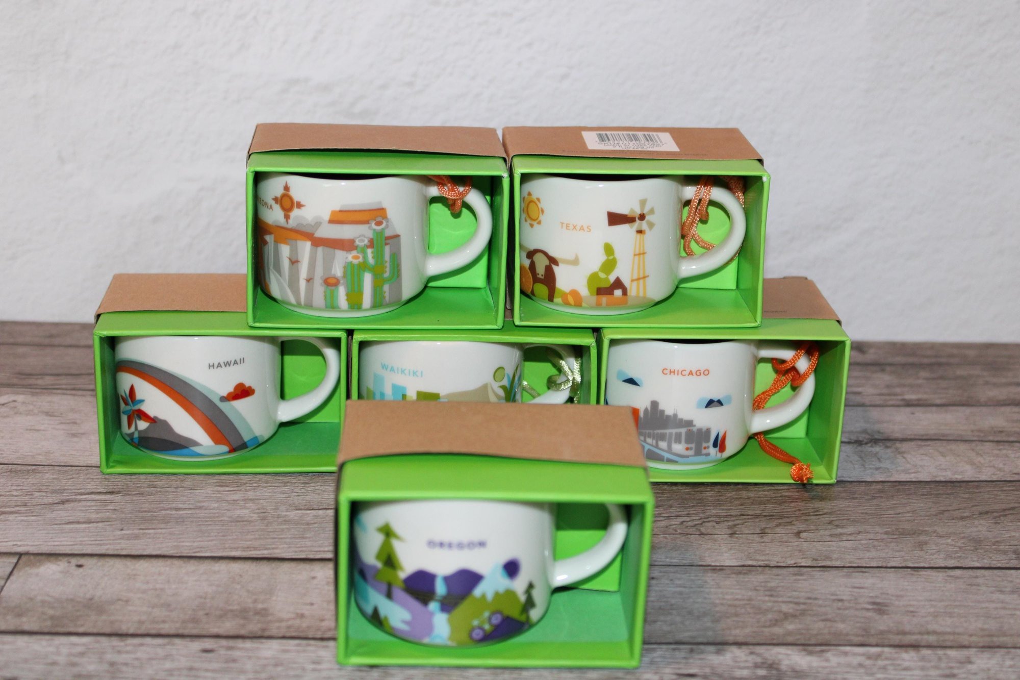 Starbucks Oregon You Are Here Collection mini mug. Featuring illustrated Oregon scenery and a vibrant blue interior. 2oz Mini Mug. Comes with box but no string.