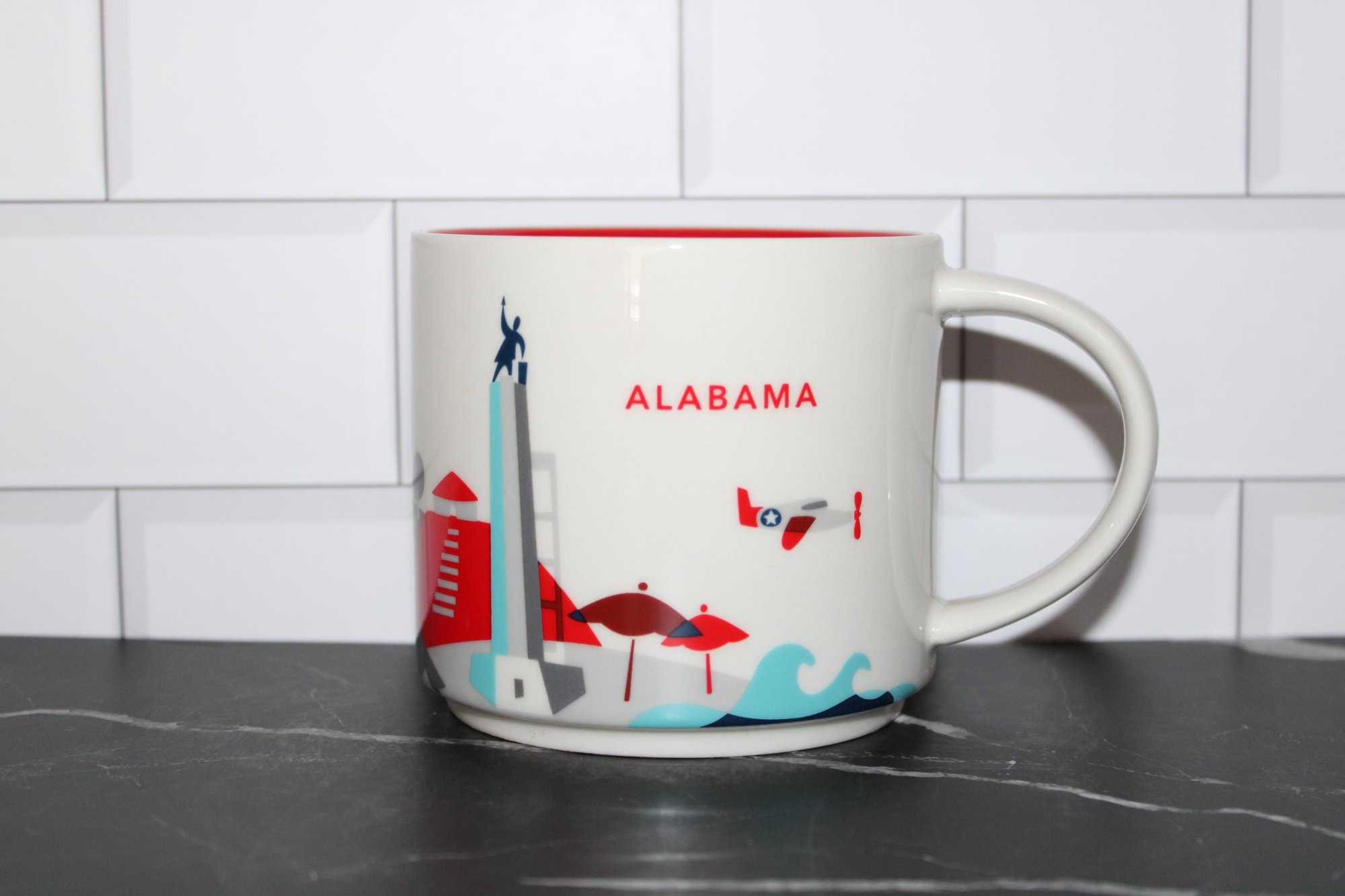 Starbucks Alabama You Are Here Collection ceramic coffee mug. This 14 oz YAH mug features colorful Alabama-themed artwork and is part of the popular Starbucks state series. Excellent used condition. No chips, cracks, or repairs observed.