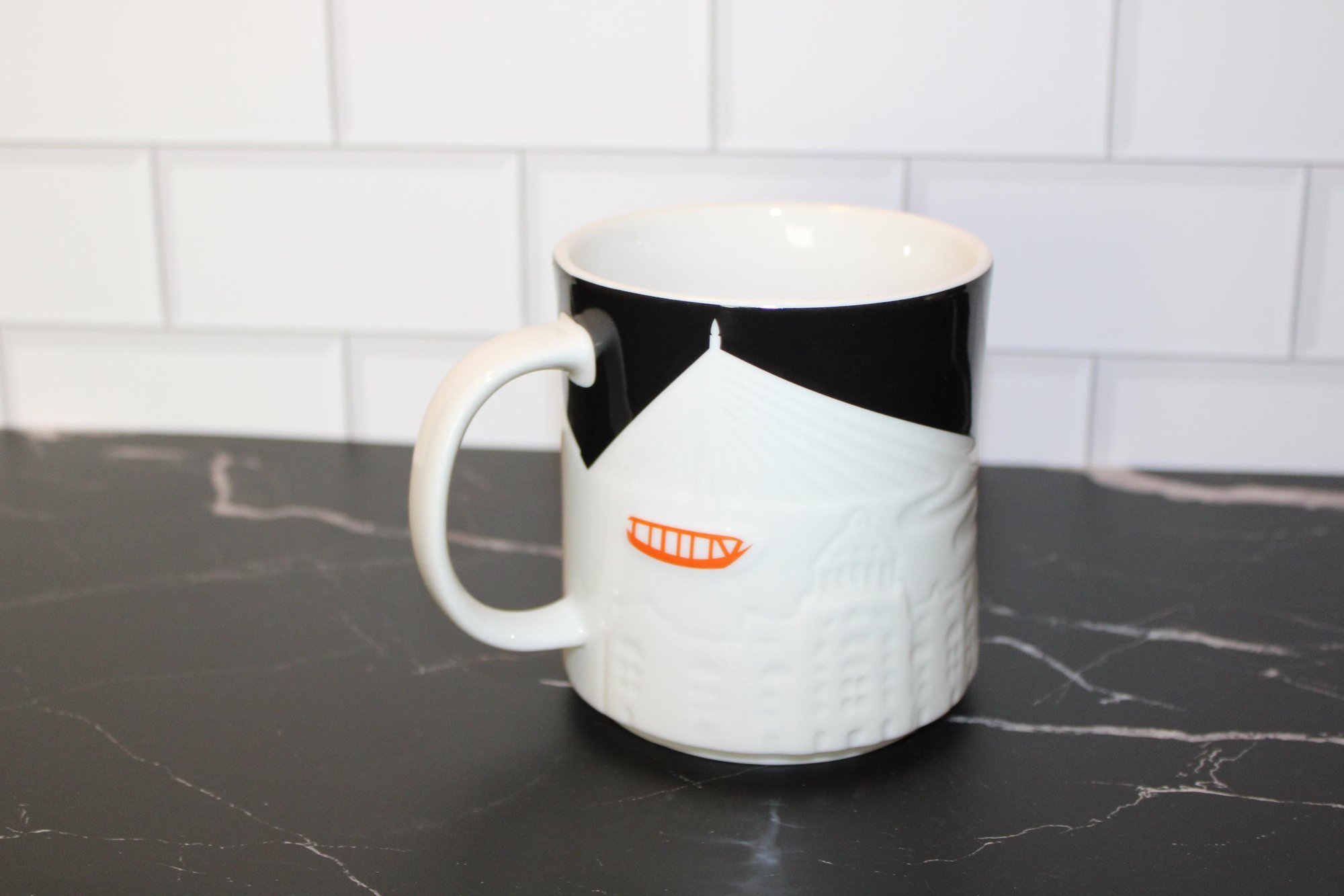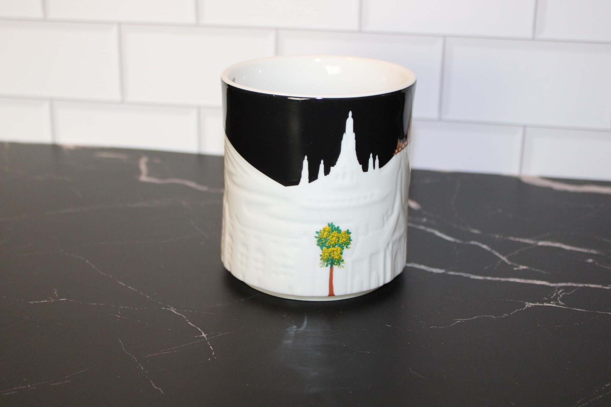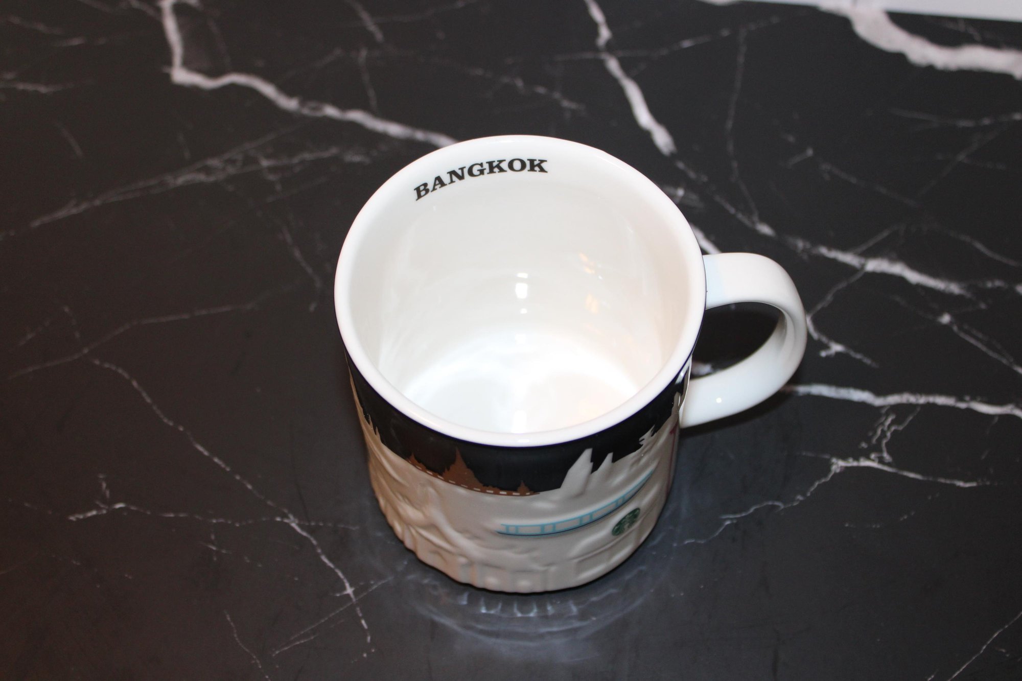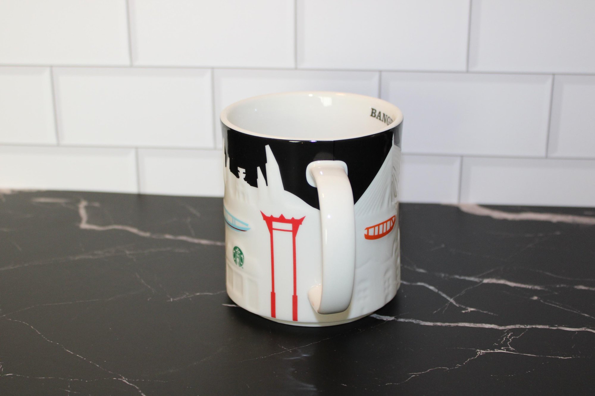 Starbucks Bangkok 3D Skyline Relief 16 oz ceramic mug featuring raised cityscape design with black rim and interior detail.