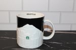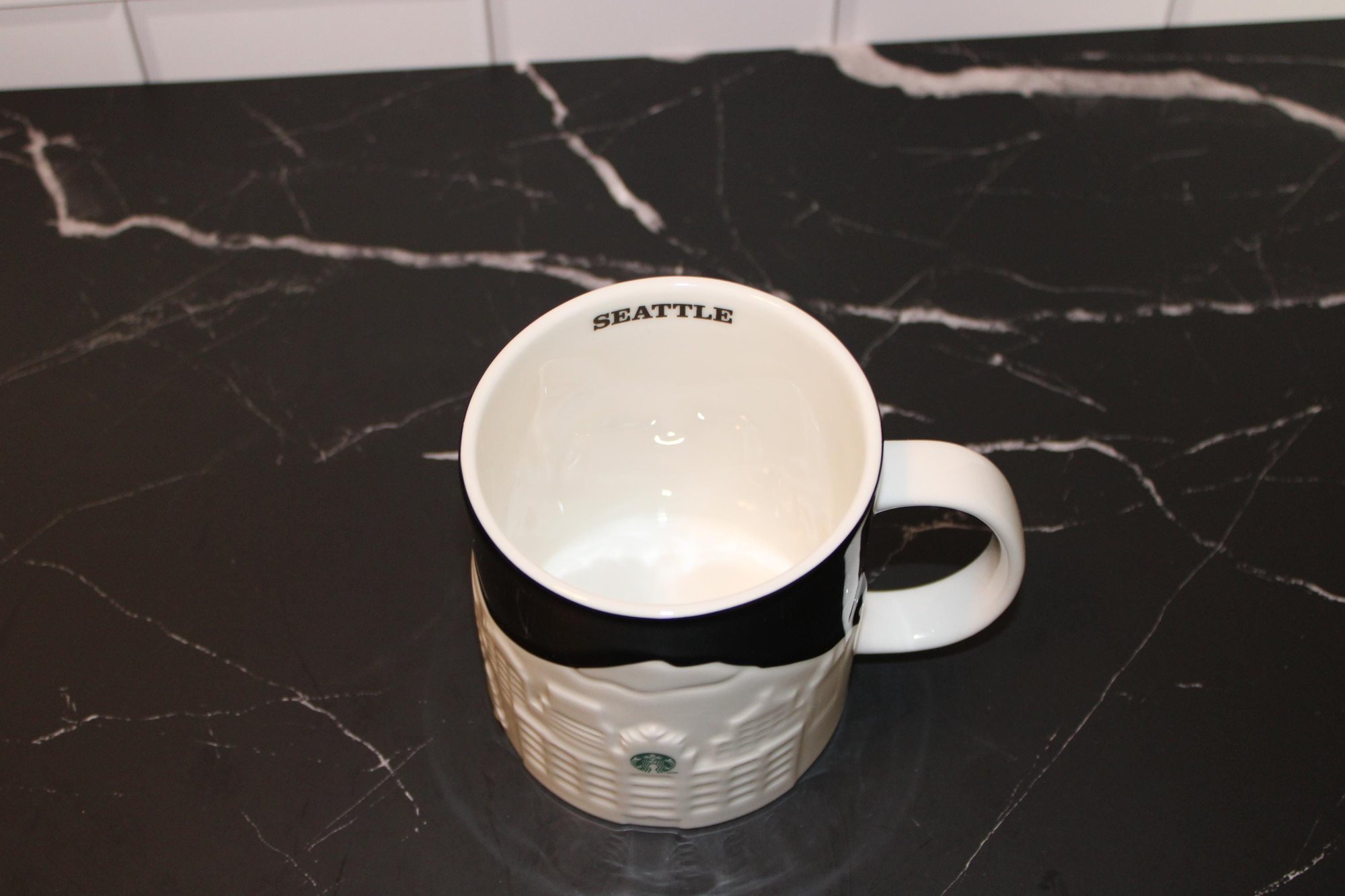 Starbucks Seattle ceramic mug featuring sculpted 3D skyline relief including the Space Needle and downtown architectural landmarks.