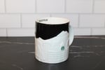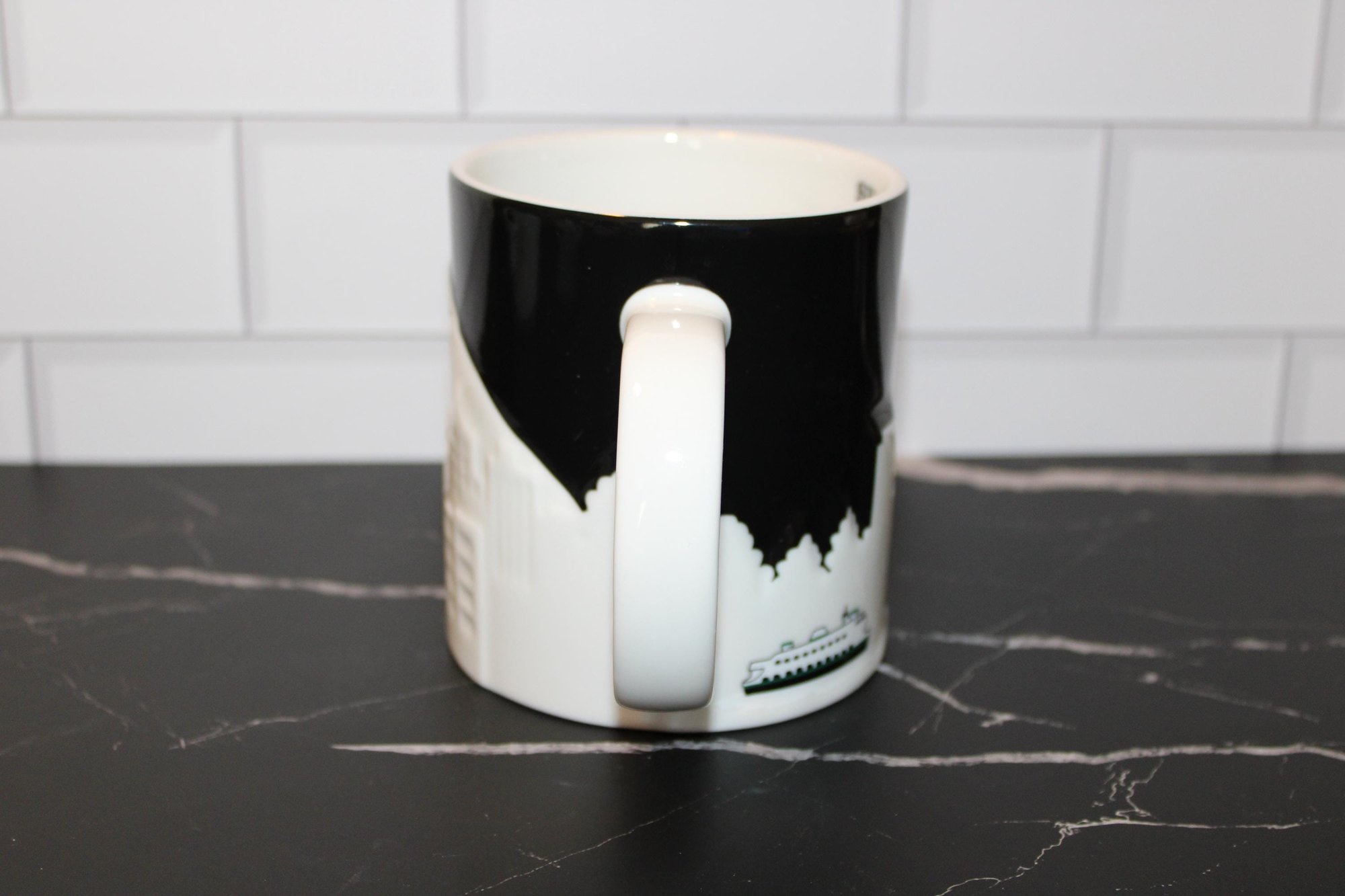 The dimensional design creates a striking cityscape along the base of the mug, contrasted by a glossy black band and classic Starbucks emblem.
