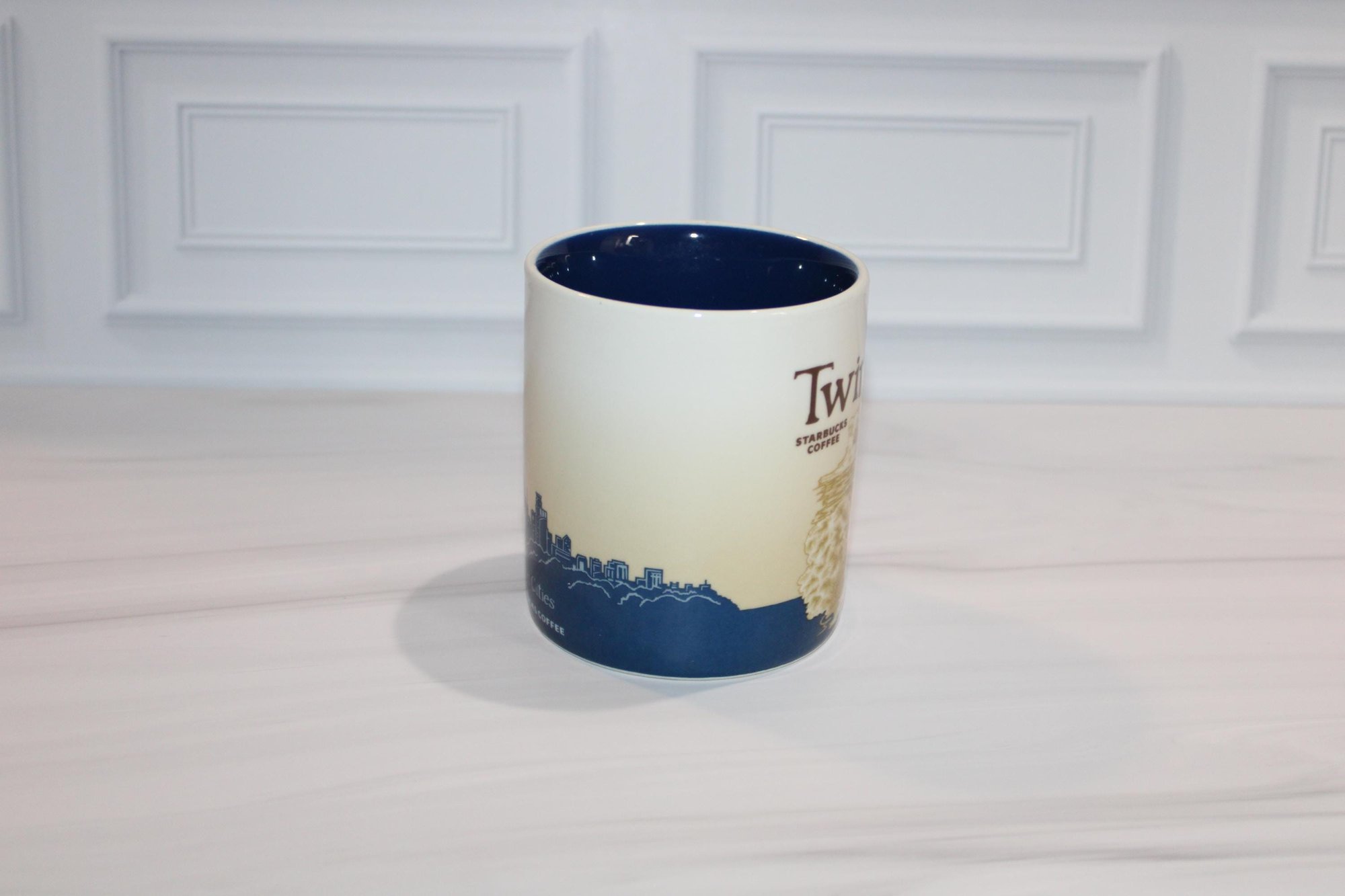 Starbucks Twin Cities Minnesota Global Icon Series 16 oz ceramic mug from 2012 featuring cityscape and waterfall design with blue interior.