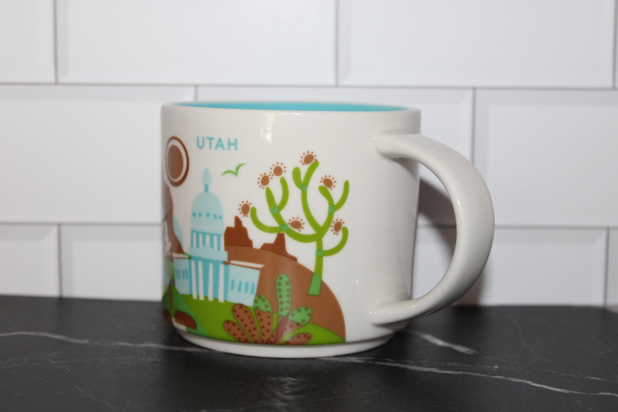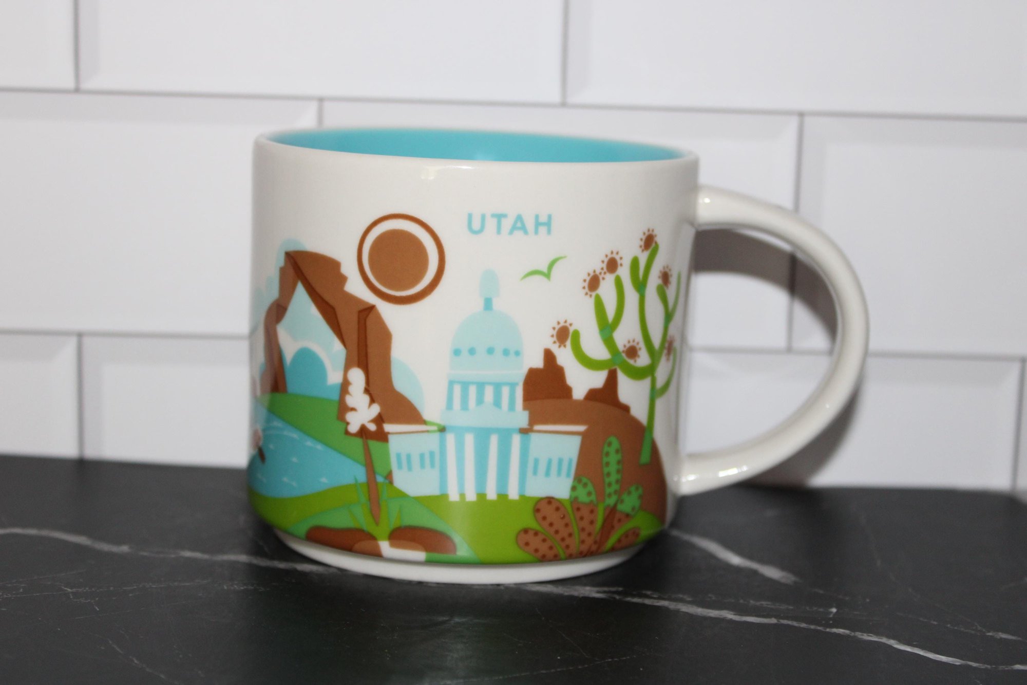 Starbucks Utah You Are Here Collection mug. This 14 oz ceramic coffee cup features colorful Utah-inspired artwork highlighting desert scenery, state landmarks, and southwestern design elements.