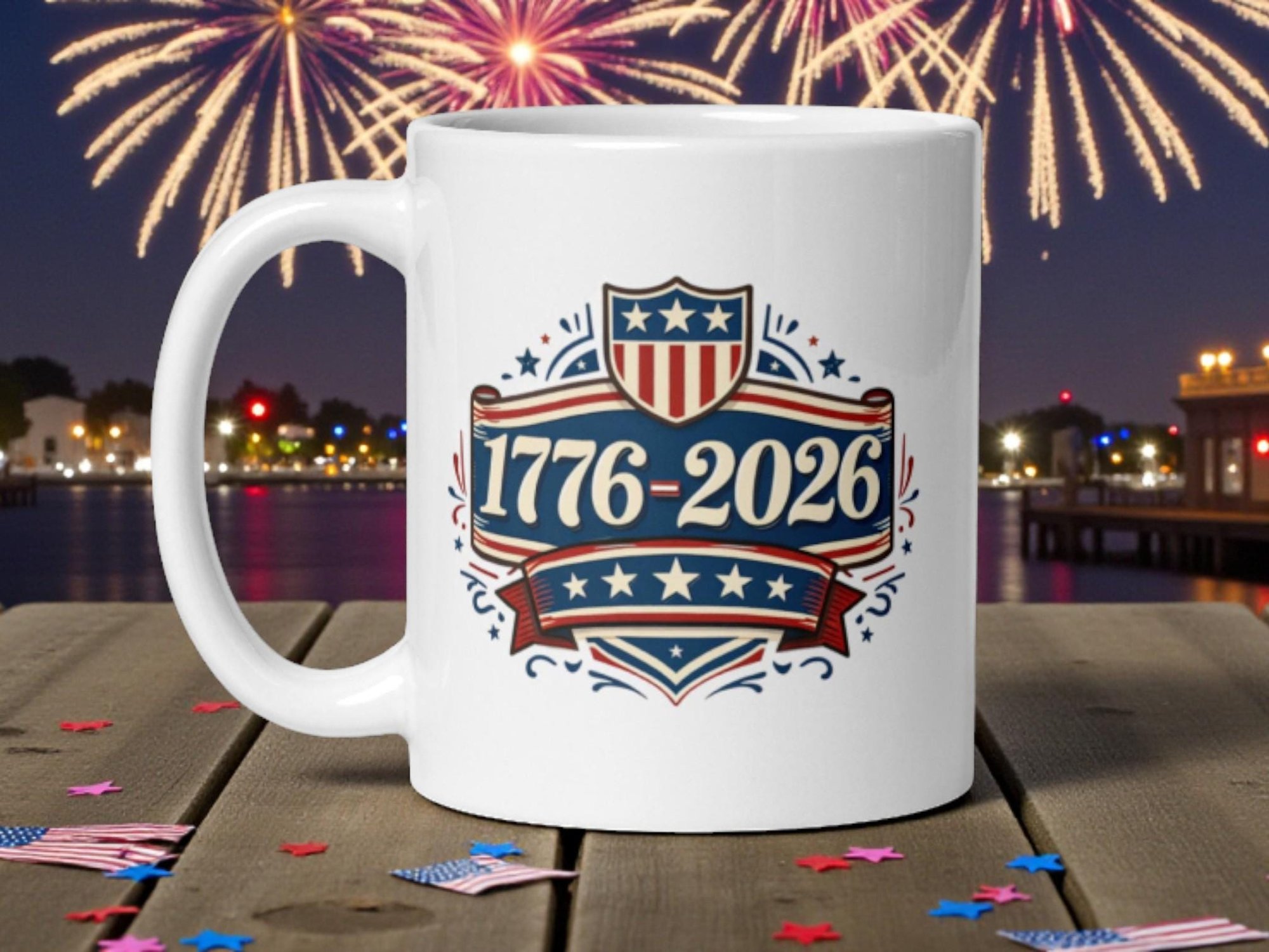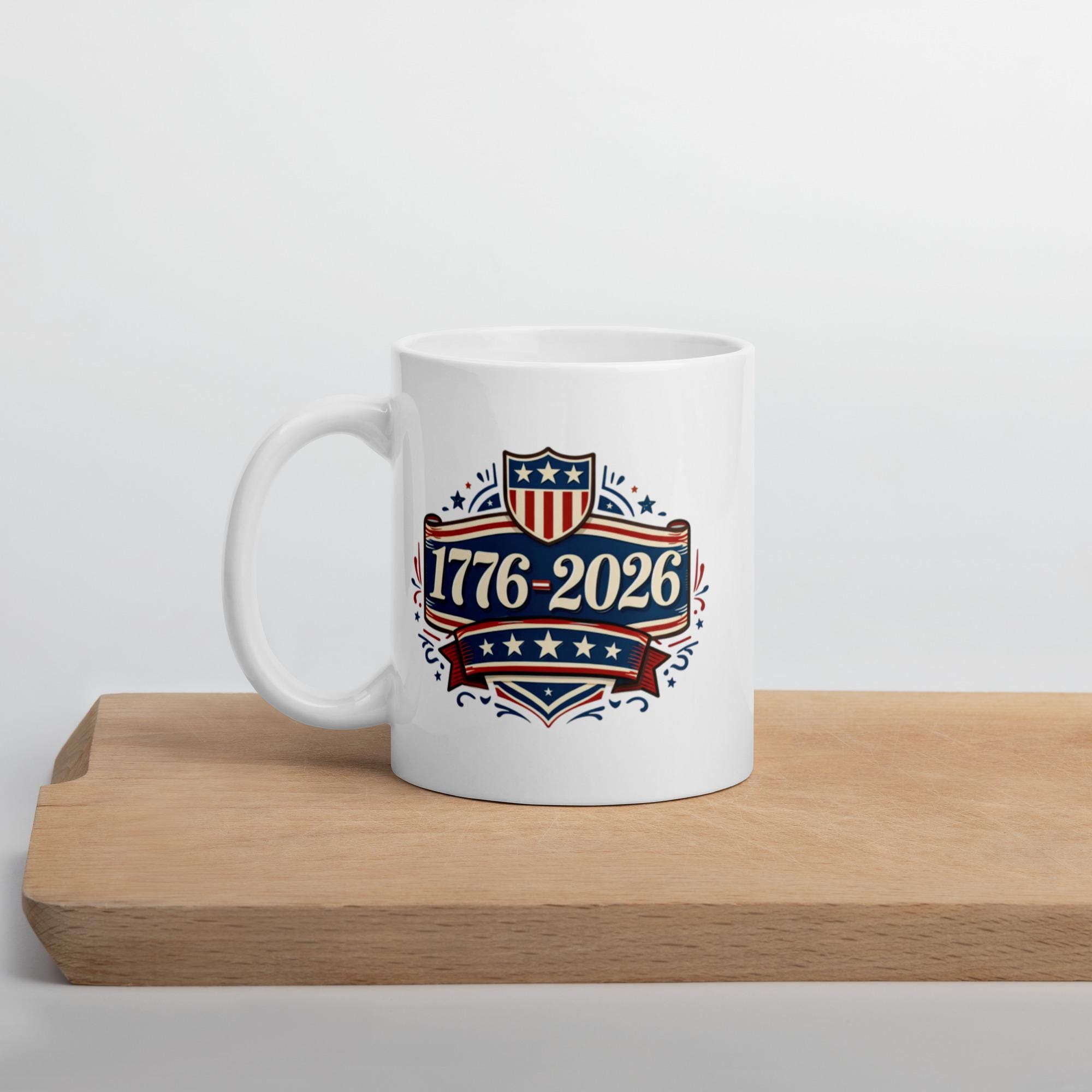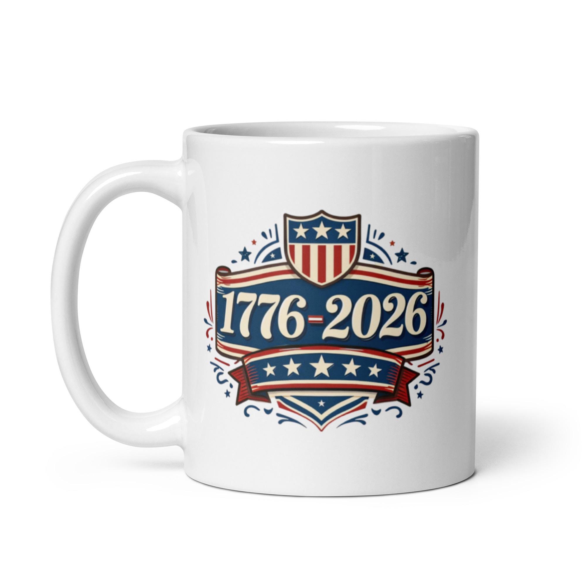 A vintage-inspired typography design celebrating 1776–2026. This retro Americana mug blends history with bold patriotic style.