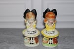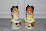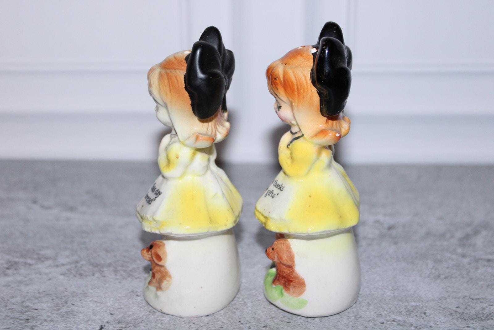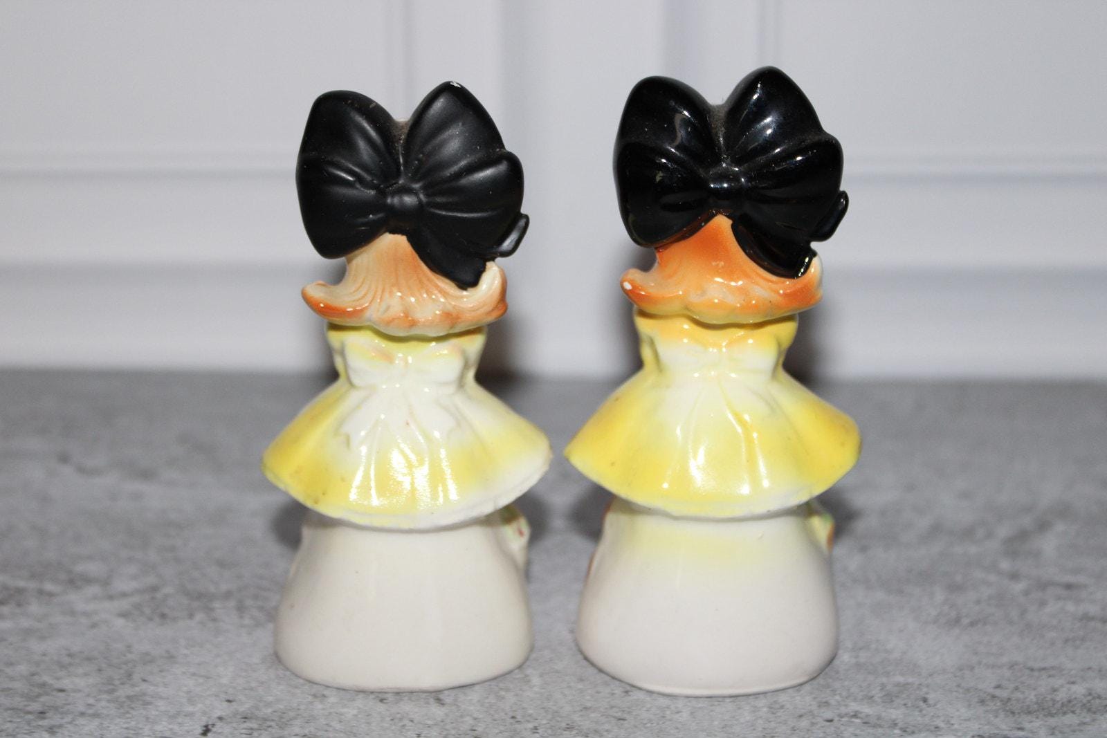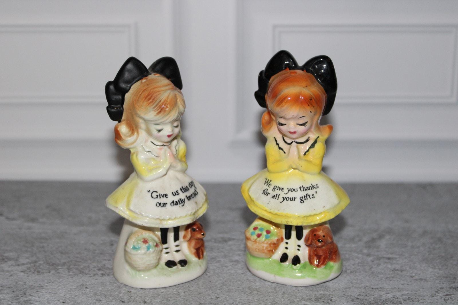 Vintage Enesco Salt & Pepper Shakers Set 2 Prayer Girls yellow black bow 1960's