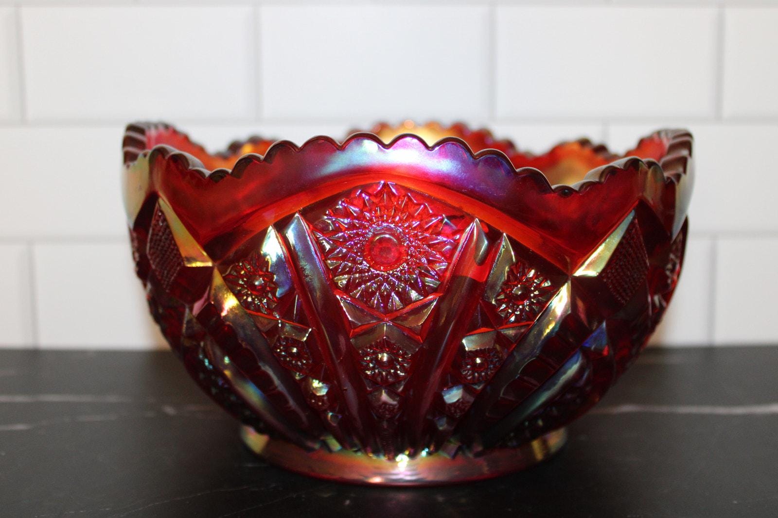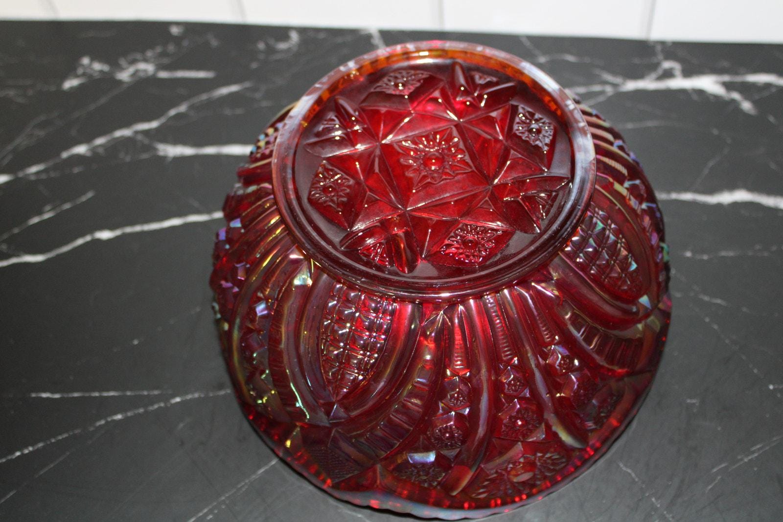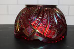 Beautiful vintage red carnival glass bowl featuring a striking iridescent finish with detailed starburst and geometric patterning.