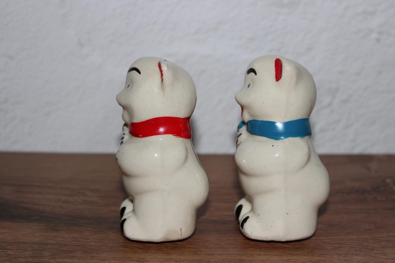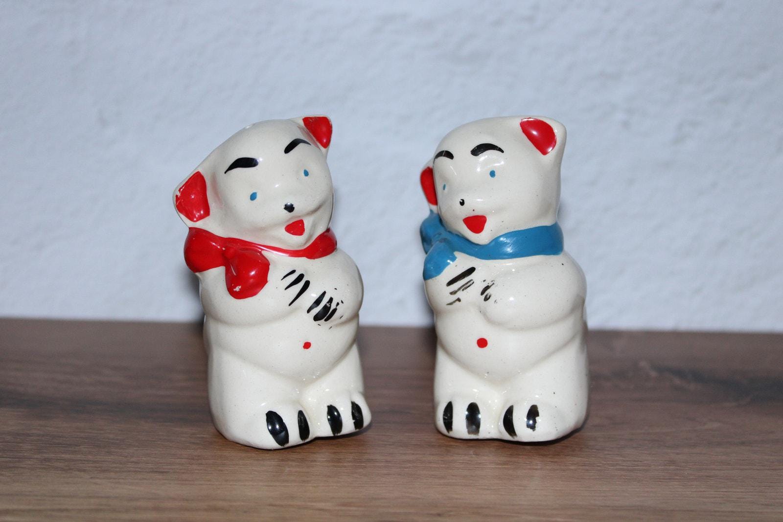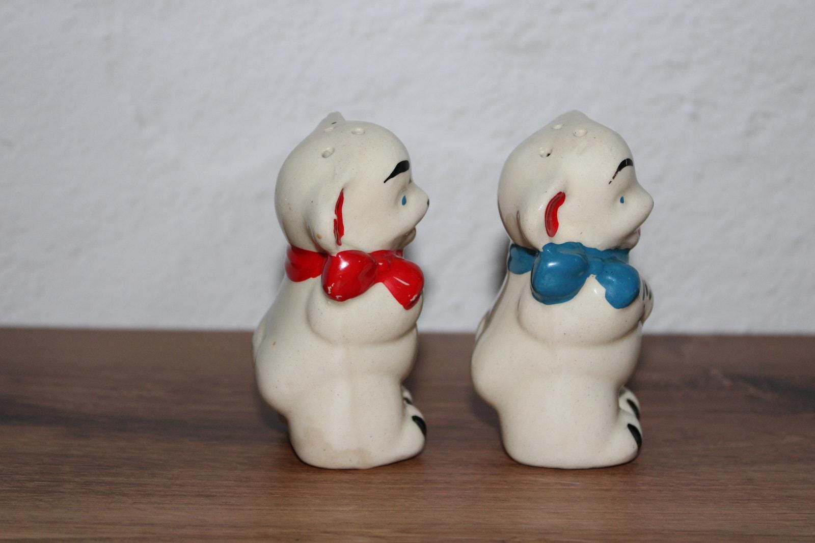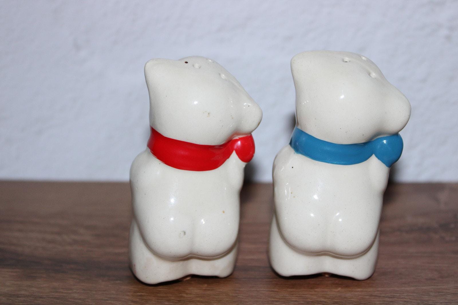 Vintage Shawnee bear salt and pepper shaker set with red and blue bows. Classic mid-century ceramic design.