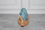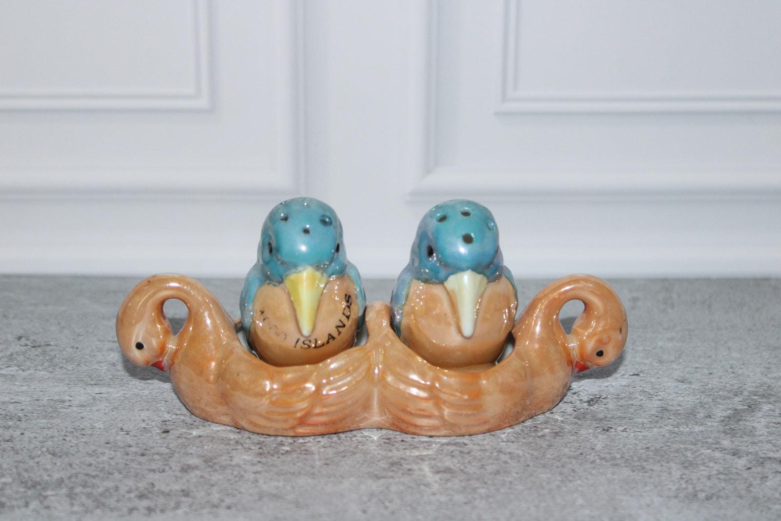 Charming vintage Japanese lusterware salt and pepper shaker set featuring two colorful birds nestled in a swan-shaped base. Hand-painted with soft iridescent tones, this mid-century piece has a whimsical, collectible feel perfect for vintage kitchen or shelf decor.